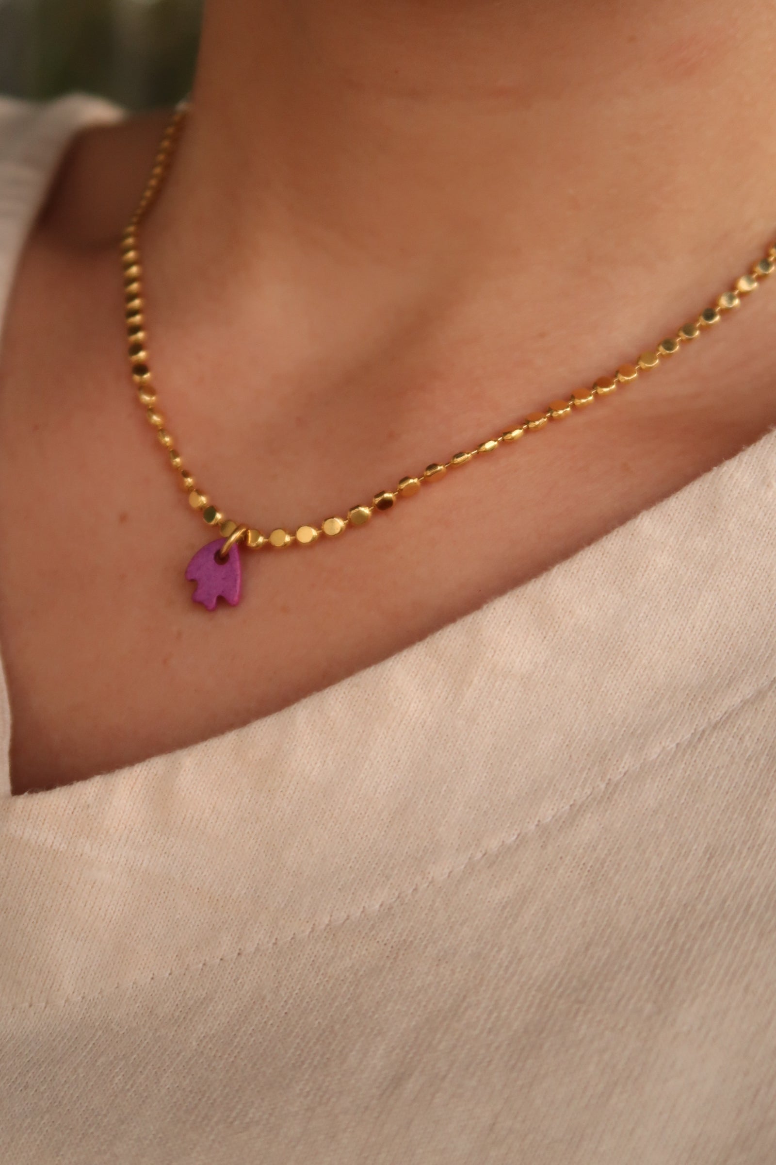 Inspired by the tiny island of Boca Chita Key, this dainty necklace features a gold beaded ball chain paired with a purple ceramic fish charm. This piece is 17" and includes a 2" extender chain, making it perfect for daily wear. It's delicate and lightweight, adding a hint of color and playful detail to your look.