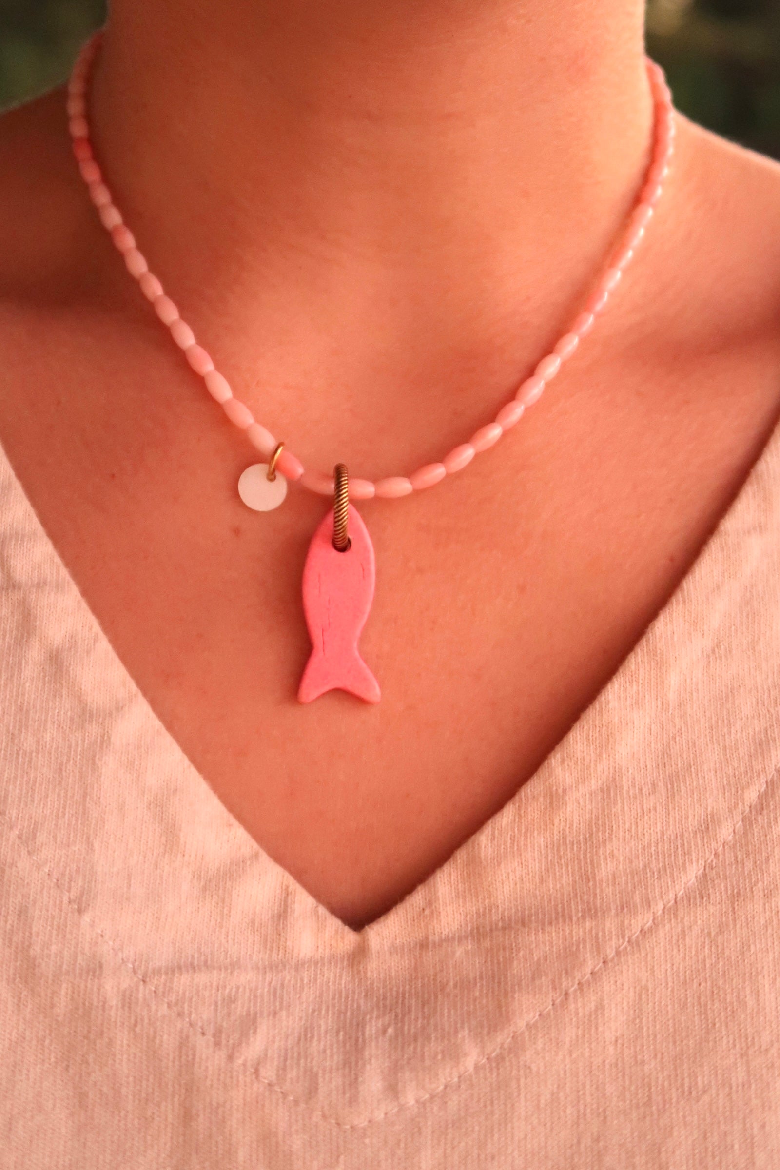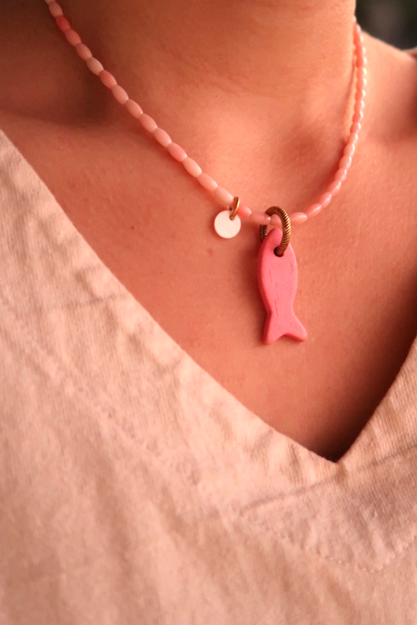 Inspired by the vibrant reefs of the Florida Keys, the Coral Bay necklace features delicate coral pink rice beads accented with a pink ceramic fish charm. Lightweight and easy to wear, it’s perfect on its own or layered with your favorite necklaces. Its eye-catching color is guaranteed to brighten up any outfit!